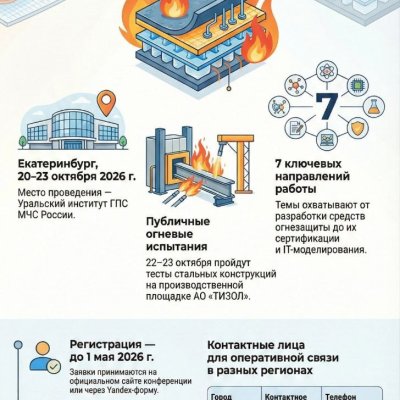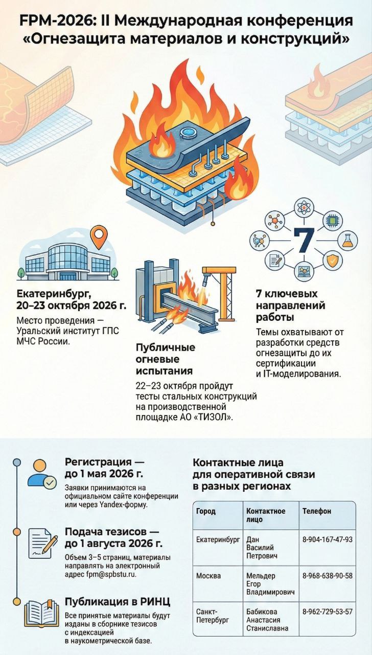 20-23 октября 2026 года на базе Уральского института государственной противопожарной службы МЧС России состоится II Международная научно-практическая конференции «Огнезащита материалов и конструкций FPM-2026». Конференция посвящена одному из наиболее важных направлений в сфере обеспечения пожарной безопасности – огнезащите материалов и конструкций. Целью конференции является создание площадки для дискуссии различных категорий специалистов в области пожарной безопасности в строительстве и огнезащитных технологий (ученых, строителей, проектировщиков, производителей, научных работников, преподавателей и студентов). Программа конференции включает серию пленарных и секционных докладов, а также минивыставку ведущих производителей огнезащиты и выездной научно-практический семинар на базе ОА "Тизол" (г. Нижняя Тура). По итогам работы конференции будет издан сборник тезисов, индексируемый РИНЦ. Срок окончания регистрации – 01 августа 2026 года